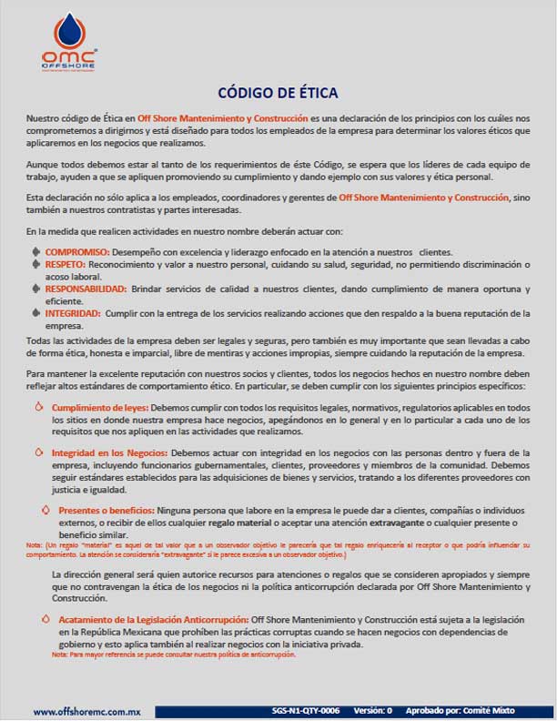 Todas las lesiones y enfermedades de trabajo se pueden y deben evitar. En OFFSHORE MANTENIMIENTO Y CONSTRUCCIÓN S.A. DE C.V. ninguna situación de operación, resultado o emergencia puede justificar la desatención de la Seguridad y Salud Ocupacional de los trabajadores. Trabajar de manera segura es condición de empleo. Nuestras operaciones o servicios siempre se brindan con los más altos estándares de Seguridad y Eficiencia, manteniendo el cuidado correspondiente con el Medio Ambiente. La Seguridad, Salud Ocupacional y Protección al Medio Ambiente deben ser integrados en todas nuestras actividades, siendo esto la base de nuestro Sistema y parte esencial del Proceso de Mejora Continua. Nos regimos bajo los Lineamientos de Sustentabilidad Ambiental y estamos comprometidos a llevar las mejores practicas ambientales en todas nuestras actividades, con el fin de crear una Cultura de Desarrollo Sustentable.